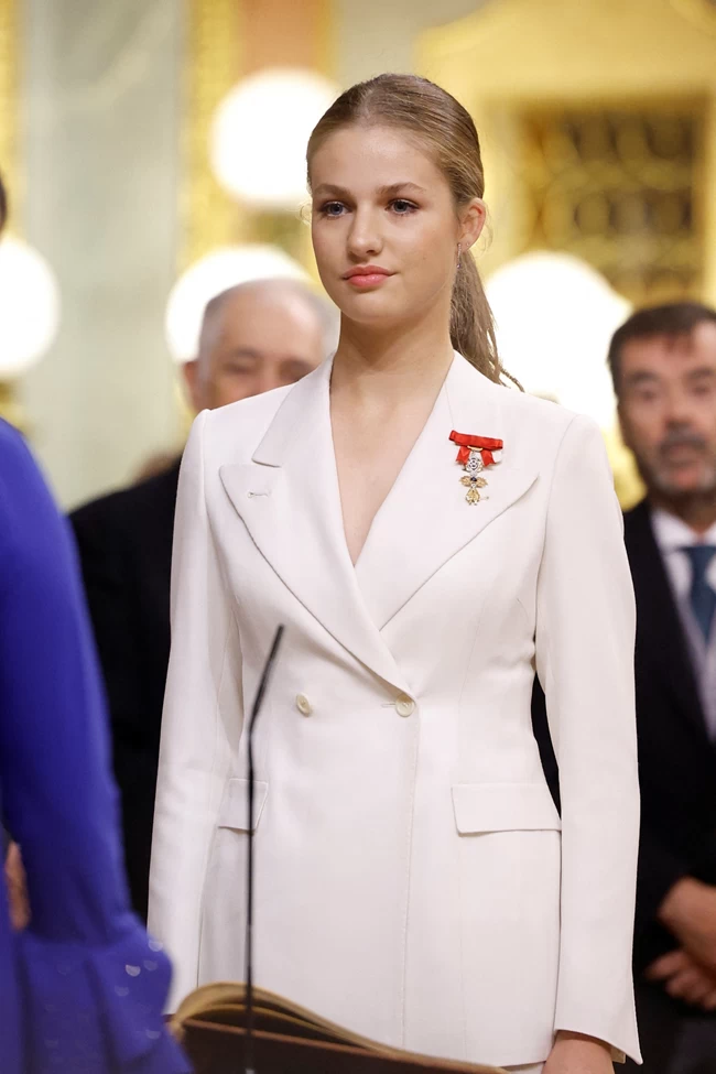 Για μια από τις πιο σημαντικές μέρες της ζωής της, η πριγκίπισσα Λεονόρ επέλεξε ένα απλό λευκό tailor-made κοστούμι από το Serna, ένα από τα παλαιότερα ραφτάδικα στην Ισπανία.