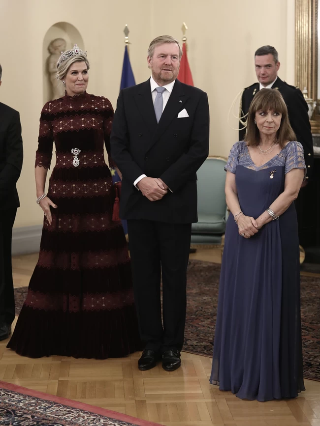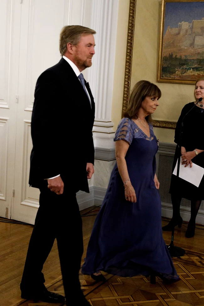 Η πρώτη μέρα της royal επίσκεψης ολοκληρώθηκε με ένα λαμπερό δείπνο στο Προεδρικό Μέγαρο με οικοδέσποινα την Πρόεδρο της Δημοκρατία Κατερίνα Σακελλαροπούλου.