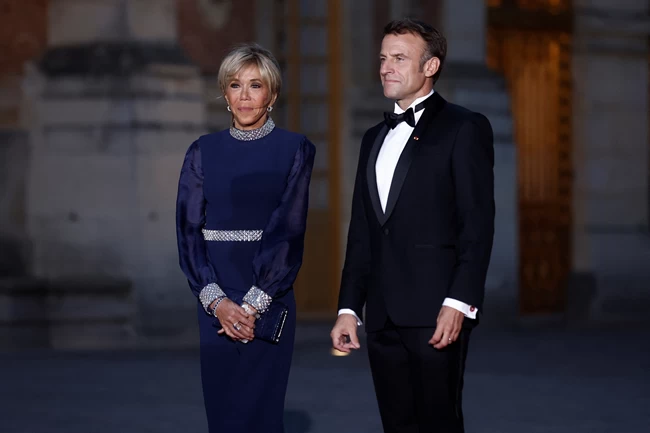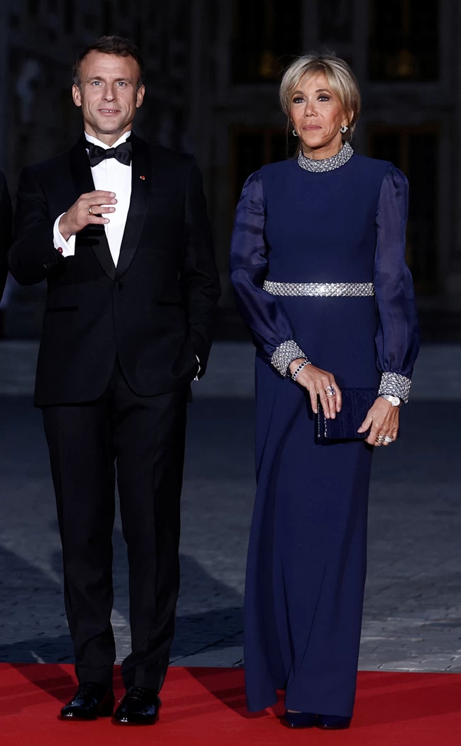Την ίδια αποχρωση επέλεξε και η Μπριζίτ Μακρόν η οποία φόρεσε ένα μάξι φόρεμα με διαφάνεια στα μανίκια και κεντημένα κρύσταλλα στην μέση στο λαιμό και στους καρπούς.