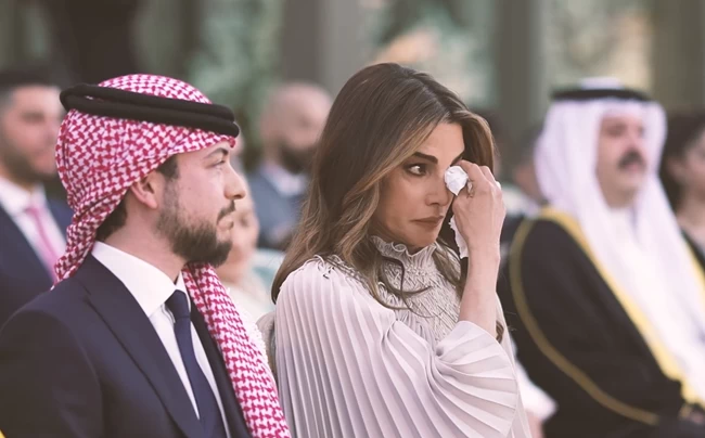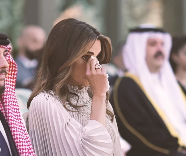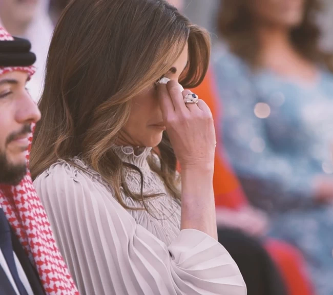 Όπως φαίνεται ξεκάθαρα στο βίντεο, η βασίλισσα Ράνια η οποία καθόταν δίπλα στον γιο της, δάκρυσε και σκούπισε τα μάτια της με ένα μαντήλι που κρατούσε στα χέρια της.