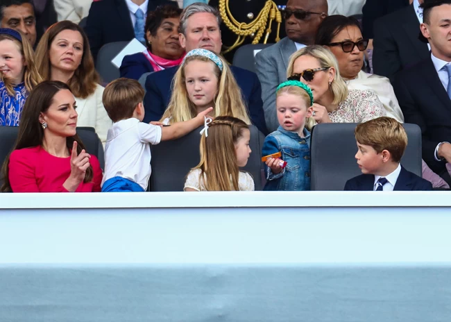 Ακριβώς πίσω από τους Κέιμπριτζ, καθόταν ο Μάικ Τίνταλ, ο σύζυγος της εγγονής της βασίλισσας Ζάρα Τίνταλ με τις κόρες τους.