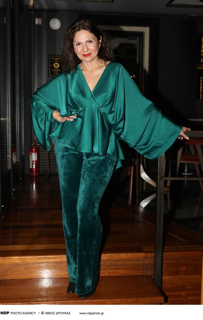 Μαζί της ήταν η ηθοποιός Αναστασία Παντούση η οποία επέλεξε μια μαύρη παντελόνα με μαύρο τοπ και σνίκερς.