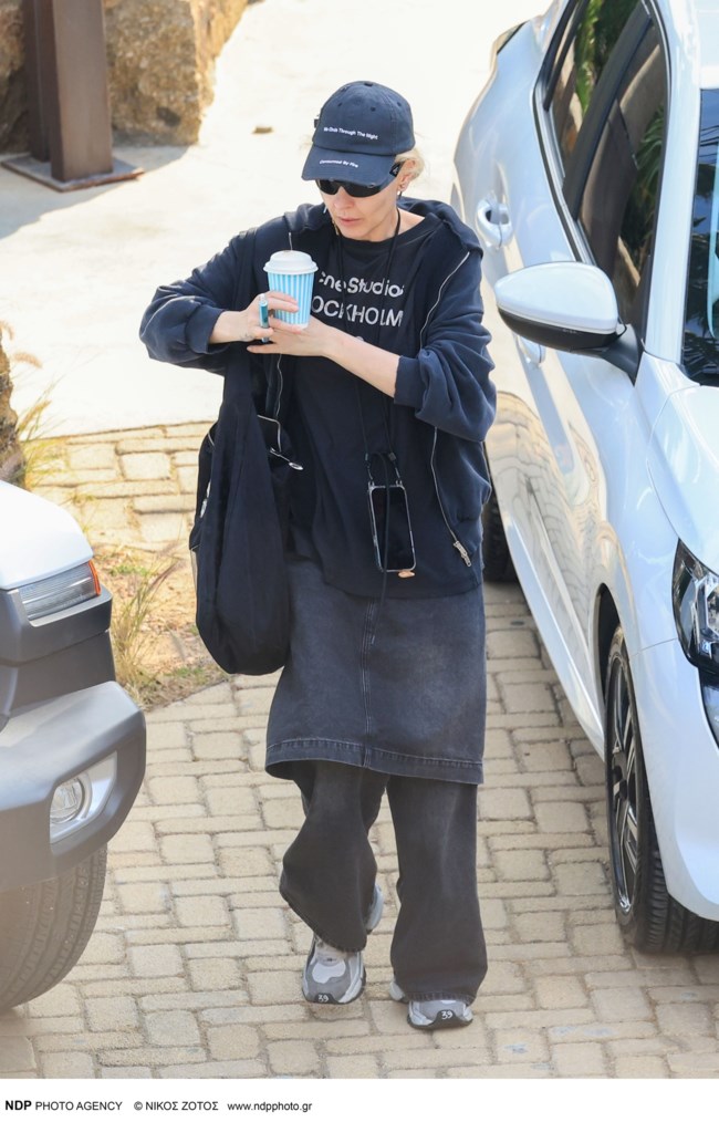 Η Τάμτα έκανε ένα layered ντύσιμο, επιλέγοντας ένα total black σύνολο, συνδυάζοντας μια denim μαύρη μακριά φούστα με φαρδύ τελείωμα πάνω από φαρδύ μαύρο παντελόνι. Το outfit ολοκληρώθηκε με oversized μαύρο hoodie και T-shirt, ενώ επέλεξε τα θρυλικά Balenciaga Triple S sneakers σε γκρι-μαύρες αποχρώσεις. Το look συμπλήρωναν μαύρα φουτουριστικά γυαλιά, καπέλο και μια μεγάλη μαύρη tote τσάντα.