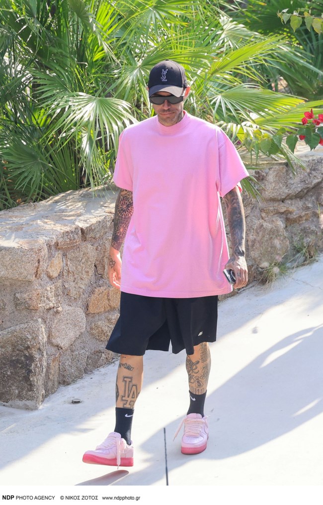 Ο Πάρης Κασιδόκωστας φόρεσε ένα ροζ oversized T-shirt, μαύρη βερμούδα και sneakers στο ίδιο ροζ χρώμα. Τα μαύρα αξεσουάρ -καπέλο και γυαλιά- ολοκλήρωσαν το στιλάτο look του.