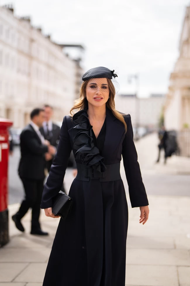 Θυμίζοντας σταρ του Χόλιγουντ, η Ράνια φόρεσε ένα μαύρο coat dress, σύμφωνα με το πρωτόκολλο, καθώς απέδωσε τα σέβη της στην εκλιπούσα ηγέτη του Ηνωμένου Βασιλείου.