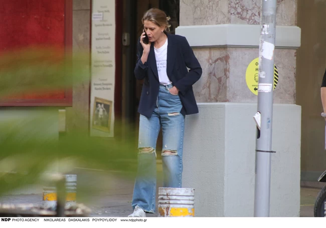 Η στιλάτη σύζυγος του Νικόλαου Γλίξμπουργκ επέλεξε ένα φαρδύ ανοιχτόχρωμο ανδρικό τζιν με σκισίματα, το οποίο συνδύασε με λευκό t-shirt και navy blazer.