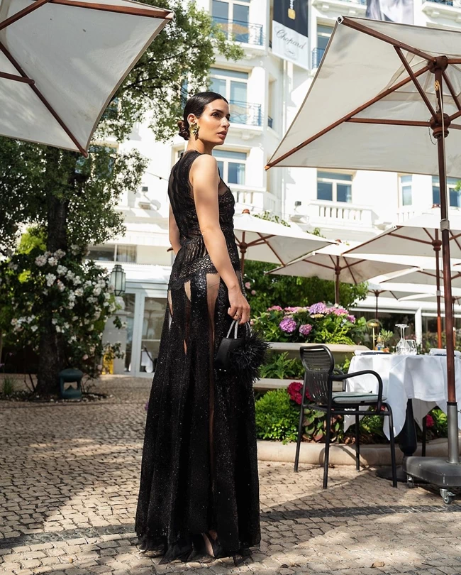 Η ηθοποιός περπάτησε με αυτοπεποίθηση στο κόκκινο χαλί φορώντας ένα δαντελένιο φόρεμα με διαφάνειες σε μαύρη απόχρωση. Το μαύρο φόρεμα είχε διαφάνειες, μαύρη δαντέλα και λωρίδες από μαύρο ύφασμα κεντημένο με παγιέτες.