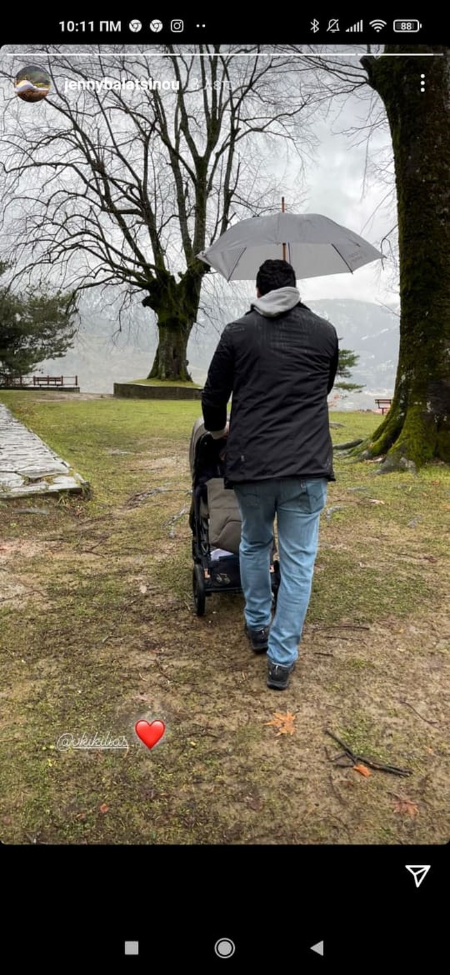 Στη μία από τις φωτογραφίες βλέπουμε τον Βασίλη Κικίλια να κάνει βόλτα τον γιο του με το καρότσι.