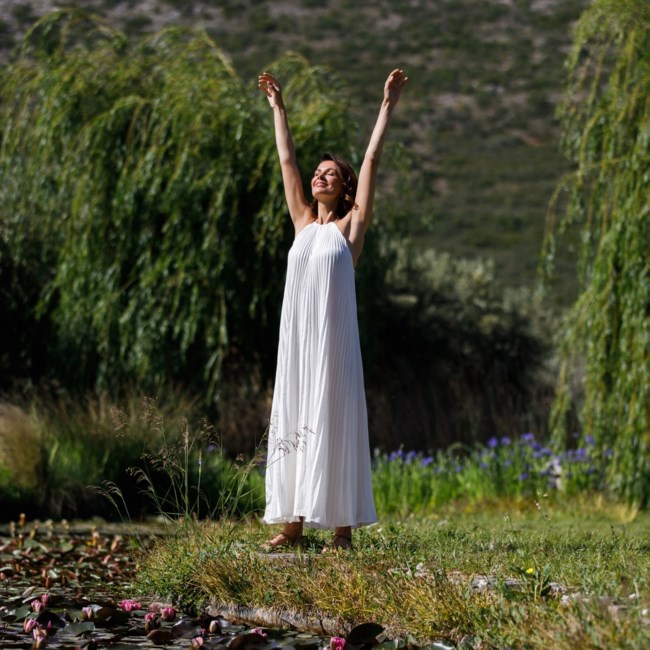 Το μακρύ λευκό φόρεμα της Αλιμόνου είχε αέρινη φινέτσα και το συνδύασε με ένα ζευγάρι δερμάτινα σανδάλια, δημιουργώντας το τέλειο Grecian chic look, που είναι ιδανικό για καλοκαιρινές εμφανίσεις.
