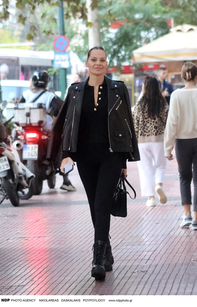 Η σύζυγος του Αντώνη Ρέμου έκανε μία total black εμφάνισ, καθώς επέλεξε να φορέσει στη βόλτα της μαύρο κολάν, μποτάκια και ένα στιλάτο δερμάτινο biker jacket.