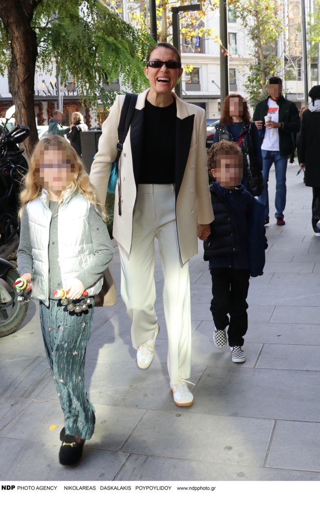 Η 45χρονη fashion expert και παρουσιάστρια βρέθηκε στο κέντρο της Αθήνας μαζί με τα δύο παιδιά της. Έχοντας εγκαταλείψει το ξανθό μαλλί και έχοντας επιλέξει ένα καστανό ανοιχτό χρώμα η Καγιά ήταν εντυπωσιακή με λευκό παντελόνι και δίχρωμο μαυρόασπρο μπλέιζερ.
