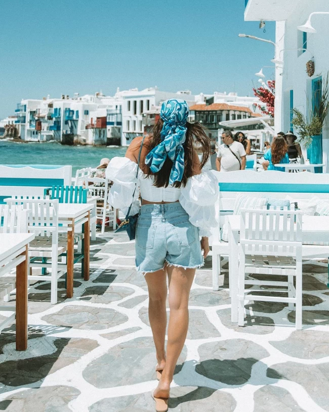 Δερμάτινα σανδάλια και μια μπλε δερμάτινη τσάντα συμπλήρωσαν το look. Η ίδια έδωσε άλλη πνοή στο ντύσιμο, με το μαντήλι που φόρεσε στο κεφάλι της στις αποχρώσεις της θάλασσας.