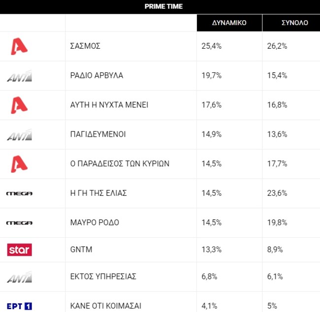 Στην prime time, σταθερός κυρίαρχος παραμένει ο Σασμός, που το βράδυ της Δευτέρας έκανε 25,4% στο δυναμικό κοινό και 26,2% στο γενικό σύνολο, ενώ σταθερά ανεβαίνει και η νέα σειρά του Alpha "Αυτή η νύχτα μένει" με τον Γιάννη Στάνκογλου και τον Βασίλη Μπισμπίκη, που ακολουθεί τον Σασμό και έκανε 17,6% στο δυναμικό κοινό και 16,8% στο γενικό σύνολο.