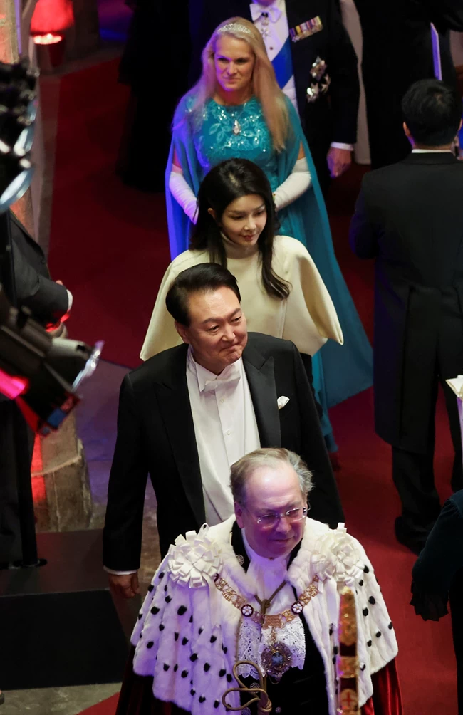 Η πρώτη κυρία της Κορέας ήταν πολύ εντυπωσιακή με μάξι κρεμ φόρεμα και μαύρη κάπα. Κράτησε μια λαμπερή τσάντα και οι γόβες της ήταν σατέν στον ίδιο χρώμα με το μάξι φόρεμα.