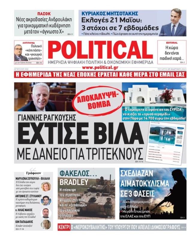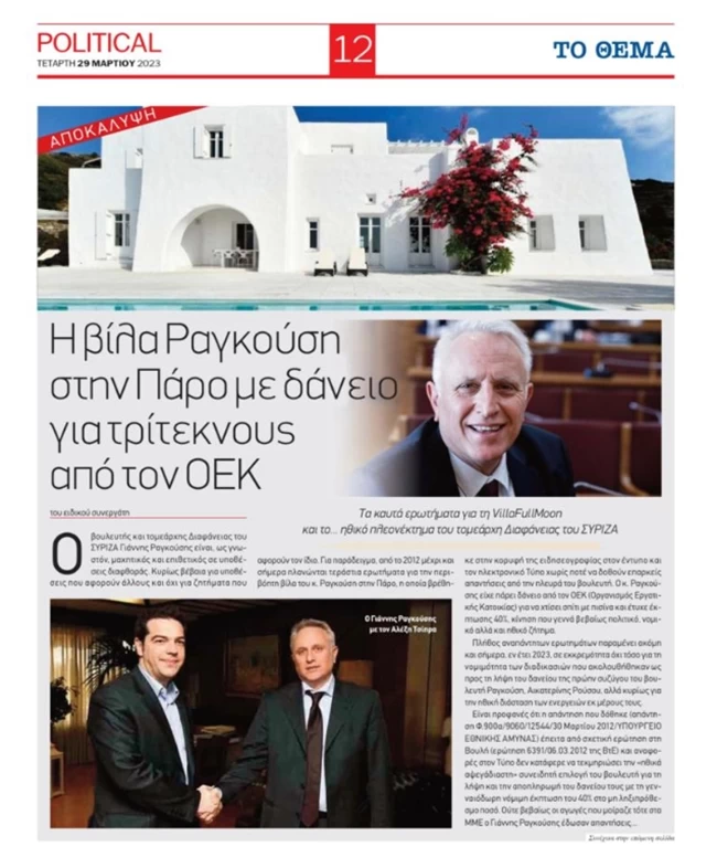 Απαντήσεις για το δημοσίευμα της ψηφιακής εφημερίδας Political που κάνει λόγο για "βίλα που διατηρεί στην Πάρο με δάνειο για τρίτεκνους", έδωσε ο Γιάννης Ραγκούσης, λέγοντας πως πρόκειται για την προσωπική του μόνιμη κατοικία και δεν είναι βίλα.