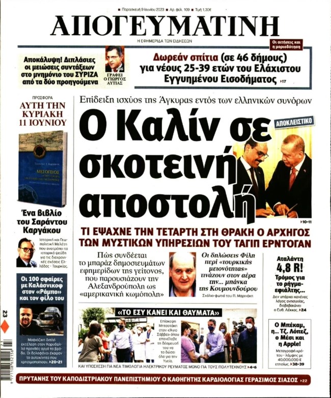 Σύμφωνα με το σημερινό πρωτοσέλιδο της "Απογευματινής", η οποία έκανε λόγο για "σκοτεινή αποστολή" του νέου διευθυντή της ΜΙΤ στη Θράκη, ο Καλίν συναντήθηκε με το προσωπικό του τουρκικού προξενείου, τους ψευτομουφτήδες και παράγοντες της μειονότητας που συνδέονται με τις μυστικές υπηρεσίες της Τουρκίας.