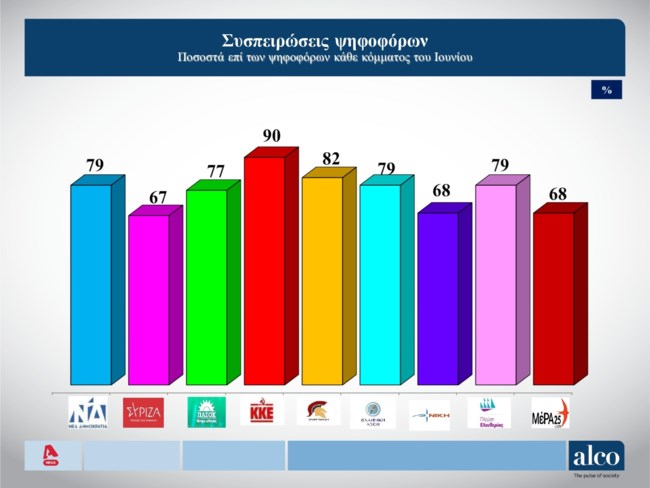 Σε επίπεδο συσπείρωσης των ψηφοφόρων, το ΚΚΕ έρχεται πρώτο σε ποσοστό 90%, με τους Σπαρτιάτες να βρίσκονται στη δεύτερη θέση με 82%. Την τρίτη θέση καταλαμβάνουν τρία κόμματα και συγκεκριμένα ΝΔ, Ελληνική Λύση και Πλεύση Ελευθερίας με 79%. Έπεται το ΠΑΣΟΚ με 77%, η Νίκη και η ΜέΡΑ25 με 68% και τελευταίος ο ΣΥΡΙΖΑ με 67%.