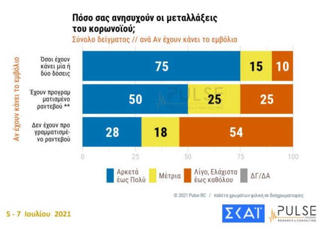 Μάλιστα, περισσότερο ανήσυχοι για τις μεταλλάξεις σε ποσοστό 75% εμφανίζονται όσοι έχουν κάνει μία ή δύο δόσεις του εμβολίου, ακολουθούν με 50% όσοι έχουν προγραμματισμένο ραντεβού για τον εμβολιασμό τους, ενώ στον αντίποδα όσοι δεν έχουν κλείσει καν ραντεβού για να εμβολιαστούν, σε ποσοστό 54% δηλώνουν ότι δεν ανησυχούν.