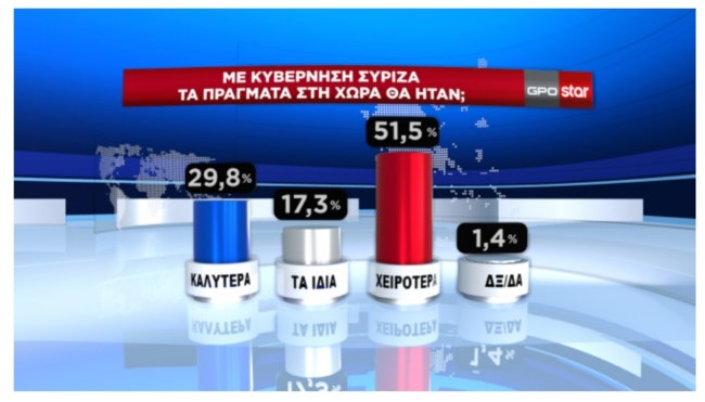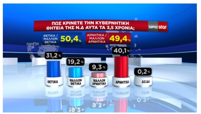 Το 50,4% των ερωτηθέντων αποτιμά θετικά και μάλλον θετικά την θητεία της κυβέρνησης ενώ το 49,4% την αποτιμά αρνητικά και μάλλον αρνητικά. Παράλληλα, το 51,4% θεωρεί ότι με κυβέρνηση ΣΥΡΙΖΑ τα πράγματα θα ήταν χειρότερα, το 29,8% ότι θα ήταν καλύτερα και το 17,3% ότι θα ήταν ίδια.