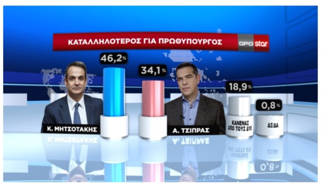 Καταλληλότερος πρωθυπουργός για το 46,2% είναι ο Κυριάκος Μητσοτάκης, ενώ για το 34,1% ο Αλέξης Τσίπρας. "Κανένας από τους δύο" απαντά το 18,9%.