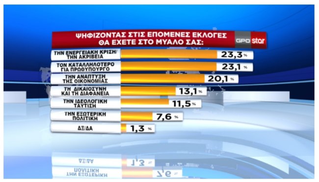 23,3% των πολιτών δηλώνουν ότι θα ψηφίσουν με την ενεργειακή κρίση και την ακρίβεια στο μυαλό τους, 23,1% με τον καταλληλότερο πρωθυπουργό, 20,1% με την ανάπτυξη της οικονομίας, 13,1% με τη δικαιοσύνη και την διαφάνεια, 11,5% με την ιδεολογική ταύτιση και 7,6% με την εξωτερική πολιτική.