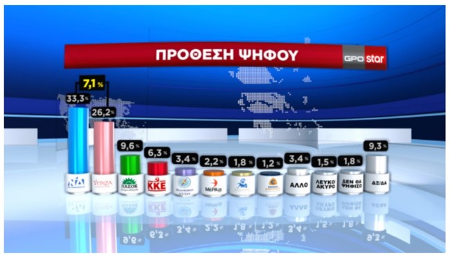Στην πρόθεση ψήφου, η ΝΔ προηγείται με 33,3% έναντι 26,2% του ΣΥΡΙΖΑ. Ακολουθούν το ΠΑΣΟΚ-Κίνημα Αλλαγής με 9,6%, το ΚΚΕ με 6,3%, η Ελληνική Λύση με 3,4%, το ΜέΡΑ25 με 2,2%, οι Έλληνες για την Πατρίδα (Κασιδιάρης) με 1,8%, Εθνική Δημιουργία (Τζήμερος-Κρανιδιώτης) με 1,2%, ενώ 9,3% των ερωτηθέντων απάντησε "δεν γνωρίζω-δεν απαντώ".