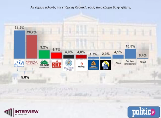 Όπως φαίνεται από την δημοσκόπηση της εταιρίας Interview που διενεργήθηκε για λογαριασμό της POLITIC η διαφορά των δύο πρώτων κομμάτων ΝΔ - ΣΥΡΙΖΑ είναι στο 5%. Υπενθυμίζεται ότι το Μάρτιο η διαφορά ήταν στο 3,6% και το Φεβρουάριο στο 6,7%.