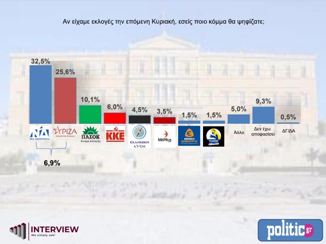 Η διαφορά μεταξύ κυβέρνησης και αξιωματικής αντιπολίτευσης είναι σήμερα στο 6,9% (από 8,5%).