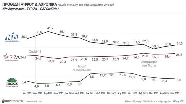 Επιπλέον, το μέχρι τότε υπό διαμόρφωση προεκλογικό κλίμα επηρεάστηκε καταλυτικά από το δυστύχημα των Τεμπών, το οποίο δίπλα στις ευθύνες της κυβέρνησης ανέδειξε συνολικά τις διαχρονικές παθογένειες του κράτους και του πολιτικού συστήματος, παγώνοντας την κοινωνία και καθηλώνοντας εν μία νυκτί την όποια επικοινωνιακή ορμή κομμάτων και φανατικών υποστηρικτών.