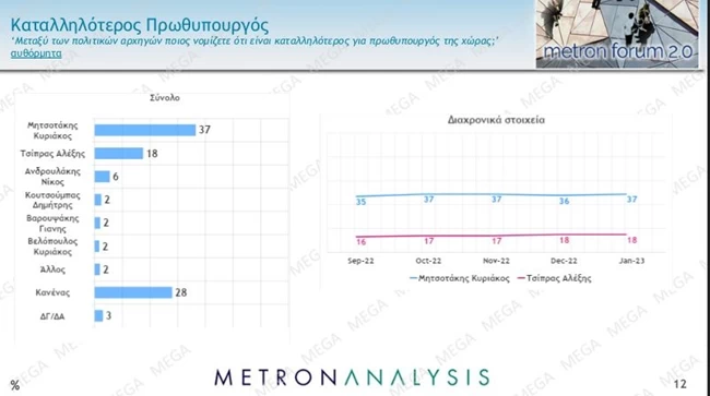 Ο Κυριάκος Μητσοτάκης παραμένει ισχυρό χαρτί για τη ΝΔ καθώς θεωρείται κατάλληλος από το 37%, με τον Αλέξη Τσίπρα στο 18% και τον Νίκο Ανδρουλάκη στο 6%.