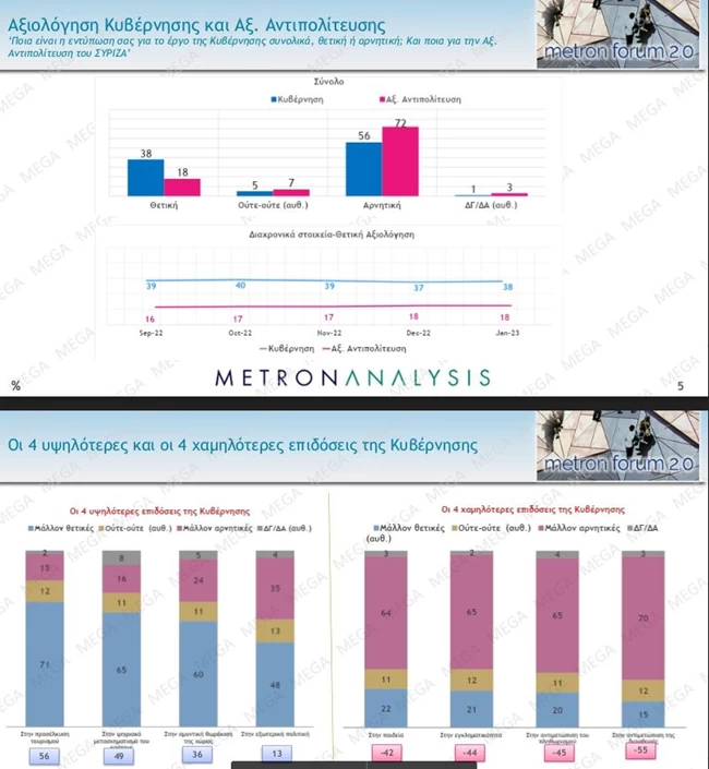 Το 38% κρίνει θετικά το έργο της κυβέρνησης και το 56% αρνητικά, όμως, πολύ άσχημα είναι τα ποσοστά για τον ΣΥΡΙΖΑ. Μόλις 18% κρίνει θετικά την αξιωματική αντιπολίτευση και 72% αρνητικά.