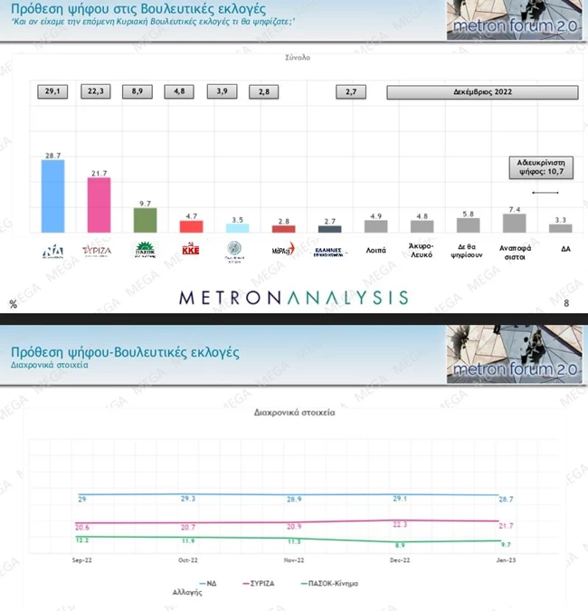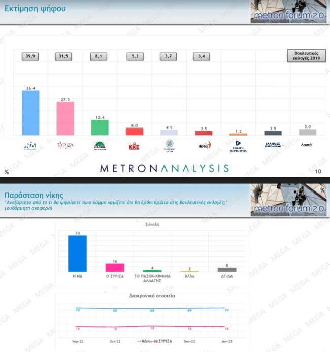 Στις 8,9 μονάδες διαμορφώνεται η διαφορά μεταξύ Νέας Δημοκρατίας και ΣΥΡΙΖΑ στην εκτίμηση ψήφου, σύμφωνα με τη δημοσκόπηση της Metron Analysis για λογαριασμό του MEGA.