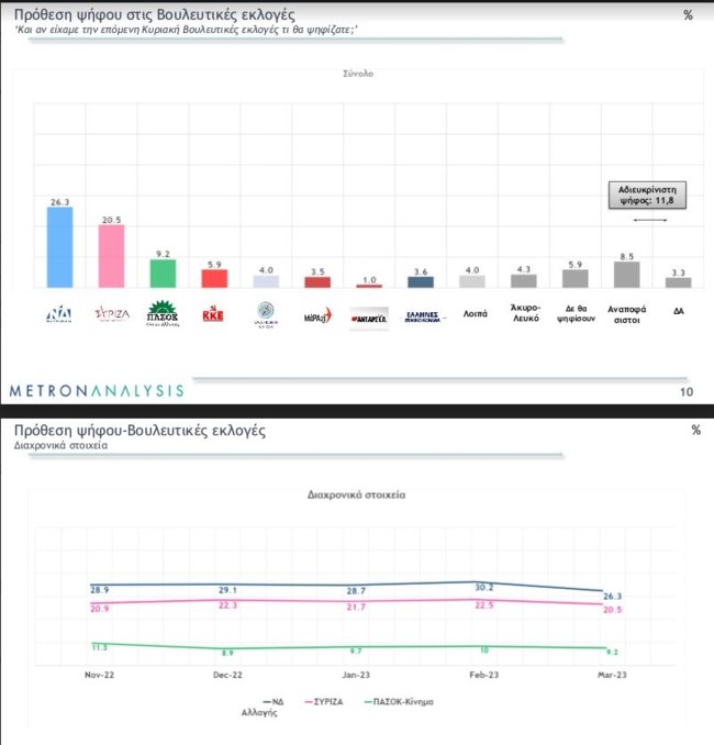 Ως προς τη διαχρονικότητα της πρόθεσης ψήφου, από τον Νοέμβριο 2022 η ΝΔ κυμάνθηκε από το 28,9% έως το 30,2% για να υποχωρήσει τώρα στο 26,5%. Ο ΣΥΡΙΖΑ κινείται από 20.9%, έκανε μια αναλαμπή τον Φεβρουάριο με 22,5% για να πέσει τώρα ξανά στο 20.5%. Το ΠΑΣΟΚ εμφανίζει πτωτικές τάσεις, από το 11,3% του Νοεμβρίου βρίσκεται πλέον στο 9,2%.