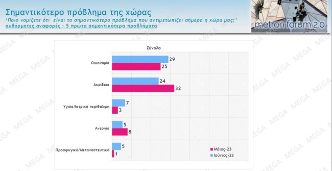 Η οικονομία με ποσοστό 29% παραμένει το νούμερο ένα πρόβλημα για τους Έλληνες και ακολουθεί η ακρίβεια με 24% (από 32%) τον Μάιο. Στο 7% η υγειονομική περίθαλψη και στο 5% η ανεργία, όπως και το προσφυγικό- μεταναστευτικό που ανέβηκε μετά το τραγικό ναυάγιο.