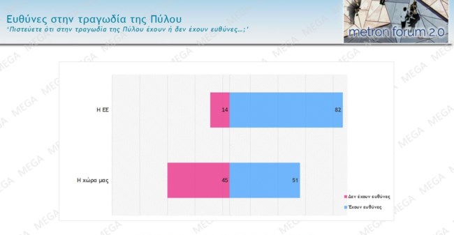 Μάλιστα, 82% πιστεύει ότι η ΕΕ έχει ευθύνες για το ναυάγιο και το 51% ότι έχει και η χώρα μας ενώ 45% λέει ότι δεν έχει.
