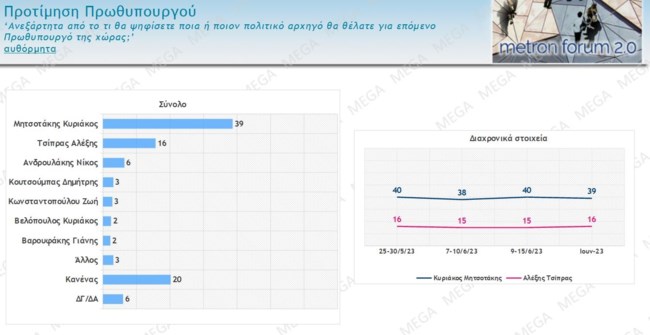Ο Κυριάκος Μητσοτάκης με 39% θεωρείται καταλληλότερος πρωθυπουργός ανεξάρτητα από το τι θα ψηφίσει κάποιος. Ακολουθεί ο Αλέξης Τσίπρας με 16%, ο Νίκος Ανδρουλάκης με 6% και ο Δ. Κουτσούμπας με τη Ζ. Κωνσταντοπούλου με 3%.