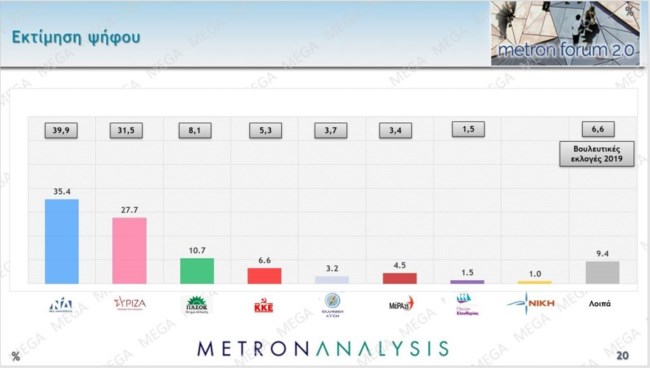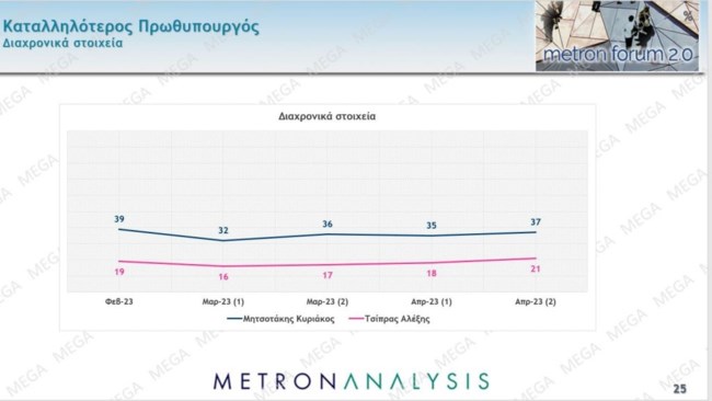 Σύμφωνα με τα ευρήματα της δημοσκόπησης της Metron Analysis για το Mega η Νέα Δημοκρατία καταγράφει ποσοστό 29,3%, με τον ΣΥΡΙΖΑ στο 23%.