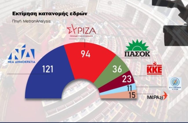 Με βάση τα ποσοστά η έρευνα της Metron Analysis δίνει 121 έδρες στη Νέα Δημοκρατία, 94 στον ΣΥΡΙΖΑ, 36 στο ΠΑΣΟΚ, 23 στο ΚΚΕ, 11 στην Ελληνική Λύση και 15 στο ΜέΡΑ 25.