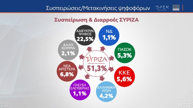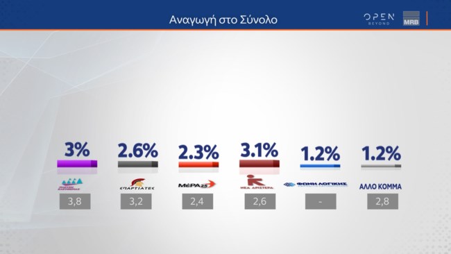 Στην τρίτη θέση δείχνει τον ΣΥΡΙΖΑ άλλη μία δημοσκόπηση, της MRB αυτή την φορά, που έγινε για λογιαρασμό του OPEN. Τα ευρήματα δείχνουν σταθερά πρώτη τη ΝΔ με το ΠΑΣΟΚ να ακολουθεί στη δεύτερη θέση, ενώ τάσεις ανόδου καταγράφει η Ελληνική Λύση, η οποία φαίνεται να περνά το ΚΚΕ.