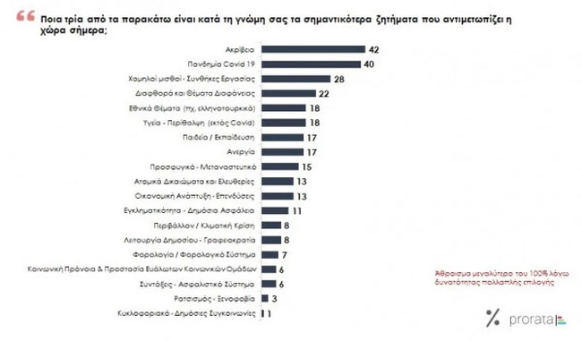 Μηνύματα προς την κυβέρνηση και απώλειες στα δημοσκοπικά ποσοστά της δείχνει η έρευνα της εταιρείας PRORATA. Ακρίβεια (42%) και η πανδημία (40%) αναδεικνύονται ως κομβικά ζητήματα που διαμορφώνουν το πολιτικό σκηνικό.