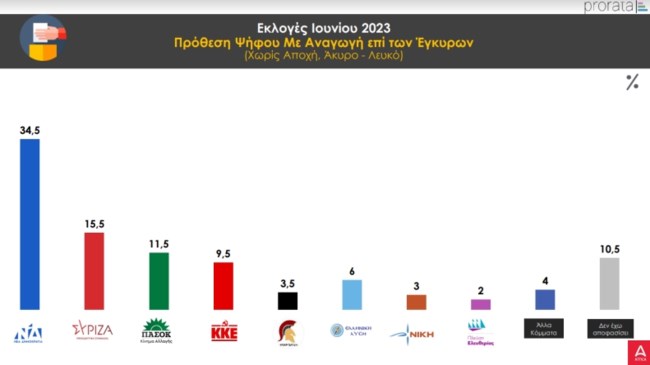 Συγκεκριμένα, στην πρόθεση ψήφου η ΝΔ προηγείται με 34,5%, ακολουθεί ο ΣΥΡΙΖΑ με 15,5%, 11,5 % είναι το ποσοστό του ΠΑΣΟΚ, ενώ μεγάλη άνοδο (9,5%) εμφανίζει η εκλογική επιρροή του ΚΚΕ. Ενισχυμένη εμφανίζεται και η Ελληνική Λύση (6%), ενώ Σπαρτιάτες, Νίκη και Πλεύση Ελευθερίας κινούνται από το 2% έως το 3,5%.
