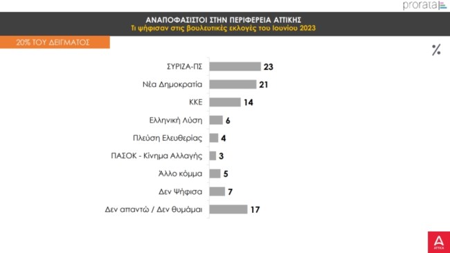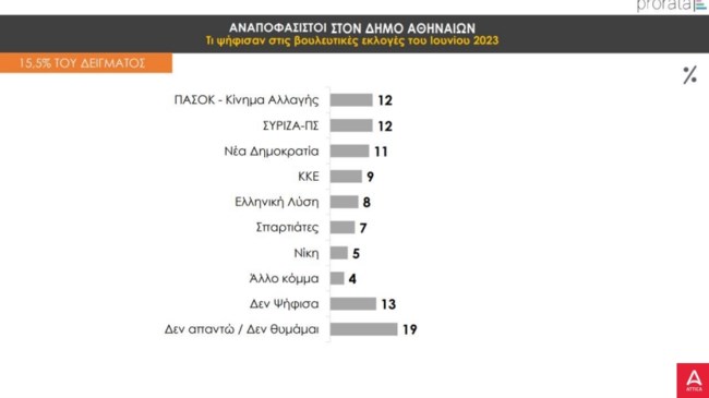 Σε 15,5 % ανέρχεται το ποσοστό των αναποφάσιστων, οι περισσότεροι των οποίων δηλώνουν ότι στις τελευταίες εκλογές ψήφισαν ΣΥΡΙΖΑ.