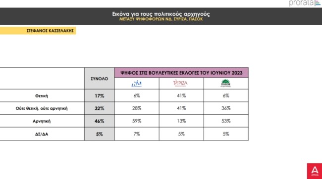 Ακόμα, η δημοσκόπηση καταγράφει τις πρώτες αξιολογήσεις των ψηφοφόρων ΝΔ, ΣΥΡΙΖΑ και ΠΑΣΟΚ για την εκλογή Κασσελάκη. Όπως προκύπτει, ο νέος πρόεδρος αντιμετωπίζεται με δυσπιστία ακόμη και από τους ψηφοφόρους του κόμματος της αξιωματικής αντιπολίτευσης, με δεδομένο ότι το 41% δηλώνει ότι δεν έχει ούτε θετική ούτε αρνητική γνώμη για εκείνον, ενώ το 13% απάντησε οτι έχει αρνητική εικόνα.