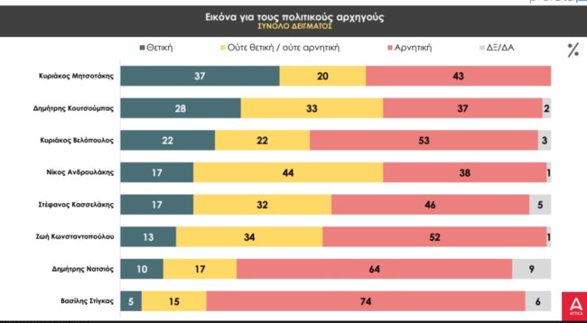 Ενδιαφέρον παρουσιάζουν και τα στοιχεία με την εικόνα που έχουν οι πολίτες για τους πολιτικούς αρχηγούς. Στη σχετική ερώτηση, θετική γνώμη για τον Κυριάκο Μητσοτάκη εκφράζει το 37% των ερωτηθέντων, δεύτερος έρχεται ο Δημήτρης Κουτσούμπας με 28%, ακολουθεί ο Κυριάκος Βελόπουλος με 22%, ενώ Στέφανος Κασσελάκης και Νίκος Ανδρουλάκης συγκεντρώνουν τις θετικές γνώμες του 17%.