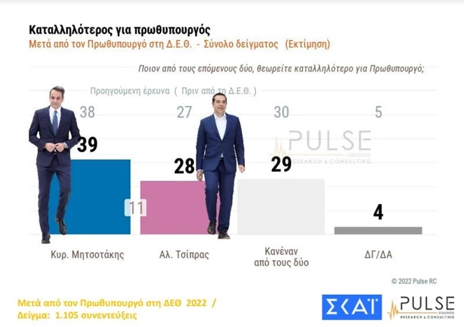 Μετά την ομιλία του στη ΔΕΘ στο ερώτημα για τον καταλληλότερο πρωθυπουργό, ο Κυριάκος Μητσοτάκης ανέβασε το ποσοστό του στο 39% έναντι 28% του Αλέξη Τσίπρα. "Κανένας από τους δύο" απάντησε το 29%.