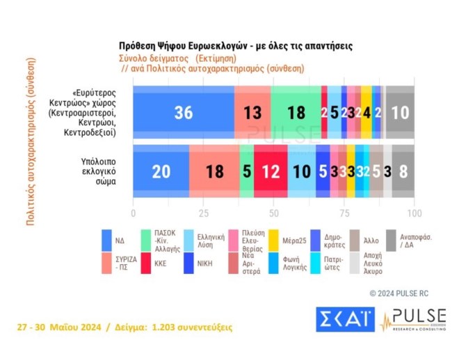 Προβάδισμα 15,5 μονάδων έναντι του δεύτερου ΣΥΡΙΖΑ δίνει στη ΝΔ η δημοσκόπηση της Pulse, για λογαριασμό του Mega, 10 ημέρες πριν τη διεξαγωγή των Ευρωεκλογών 2024.