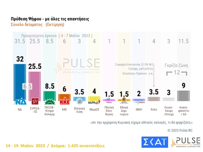 Στις 6,5 μονάδες κυμαίνεται η διαφορά ανάμεσα στη ΝΔ και τον ΣΥΡΙΖΑ, σύμφωνα με τη δημοσκόπηση της Pulse που παρουσιάσθηκε στο κεντρικό δελτίο ειδήσεων του ΣΚΑΪ.