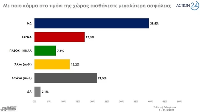 Η πανελλήνια έρευνα που πραγματοποιήθηκε, για λογαριασμό του ACTION24, στην τελική ευθεία πριν από τις κάλπες της Κυριακής, εμφανίζει τη ΝΔ να συγκεντρώνει ποσοστό 30,8%, τον ΣΥΡΙΖΑ 24,2%, το ΠΑΣΟΚ 9,8%, το ΚΚΕ 7,7%, το ΜέΡΑ25 3,2% και την Ελληνική λύση 2,7%.