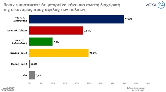 Σε ό,τι αφορά τους επιμέρους δείκτες η εικόνα του Κυριάκου Μητσοτάκη υπερέχει αυτής του Αλέξη Τσίπρα. Είναι χαρακτηριστικό ότι στην καταλληλότητα για την πρωθυπουργία ο Κυριάκος Μητσοτάκης προηγείται με 24,1% έναντι του Αλέξη Τσίπρα.