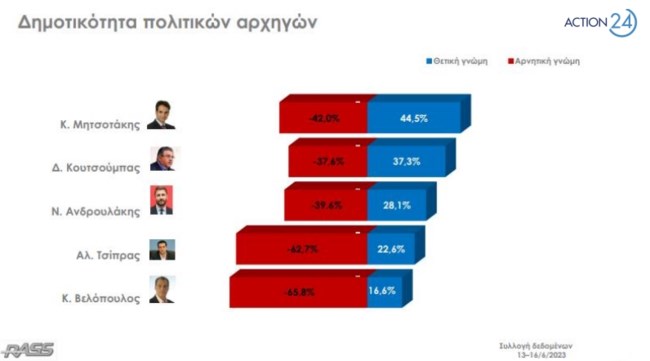 Προβάδισμα 23,4 ποσοστιαίων μονάδων της ΝΔ έναντι του ΣΥΡΙΖΑ εμφανίζει η δημοσκόπηση της RASS, που διενεργήθηκε για λογαριασμό του ACTION24.